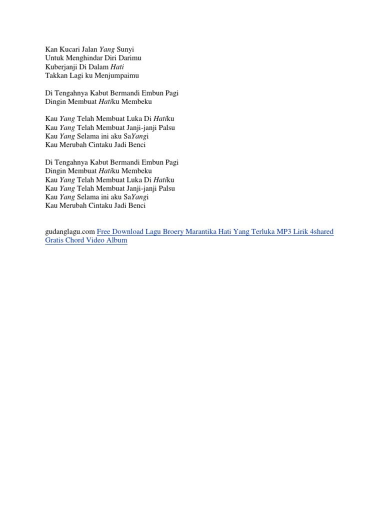 Yovie dimulai dengan y, klik y. Ingat like, comment & subscribe yaa. intro: bm em c#m f# bm. Disini kamu bisa denger lagu hati yang terluka dari album hati yang terluka. Lirik lagu dari broery marantika. Lirik dan chord lagu terlengkap, paling akurat dan terpercaya, berikut lirik lagu : Sebuah lagu kenangan dari broery marantika dengan chord mudah dan sederhana. verse bm em kan ku cari jalan yang sunyi c#m f# bm untuk menghindar darimu. Download lagu hati yang terluka broery dapat kamu download secara gratis di downloadlagu321.site. Felix & tebovideo edit : ★ lagump3downloads.net on lagump3downloads.net we do not stay all the mp3 files as they are in different websites from which we collect links in mp3 format, so that we do not violate any copyright. Download lagu hati yang terluka broery mp3 dapat kamu download secara gratis di metrolagu. Kan kucari jalan yang sunyi untuk menghindar darimu ku berjanji di dalam hati takkan lagi ku menjumpaimu di tengahnya kabut bermandi embun pagi dingin membuat hatiku membeku kau yang telah membuat luka di hatiku kau.