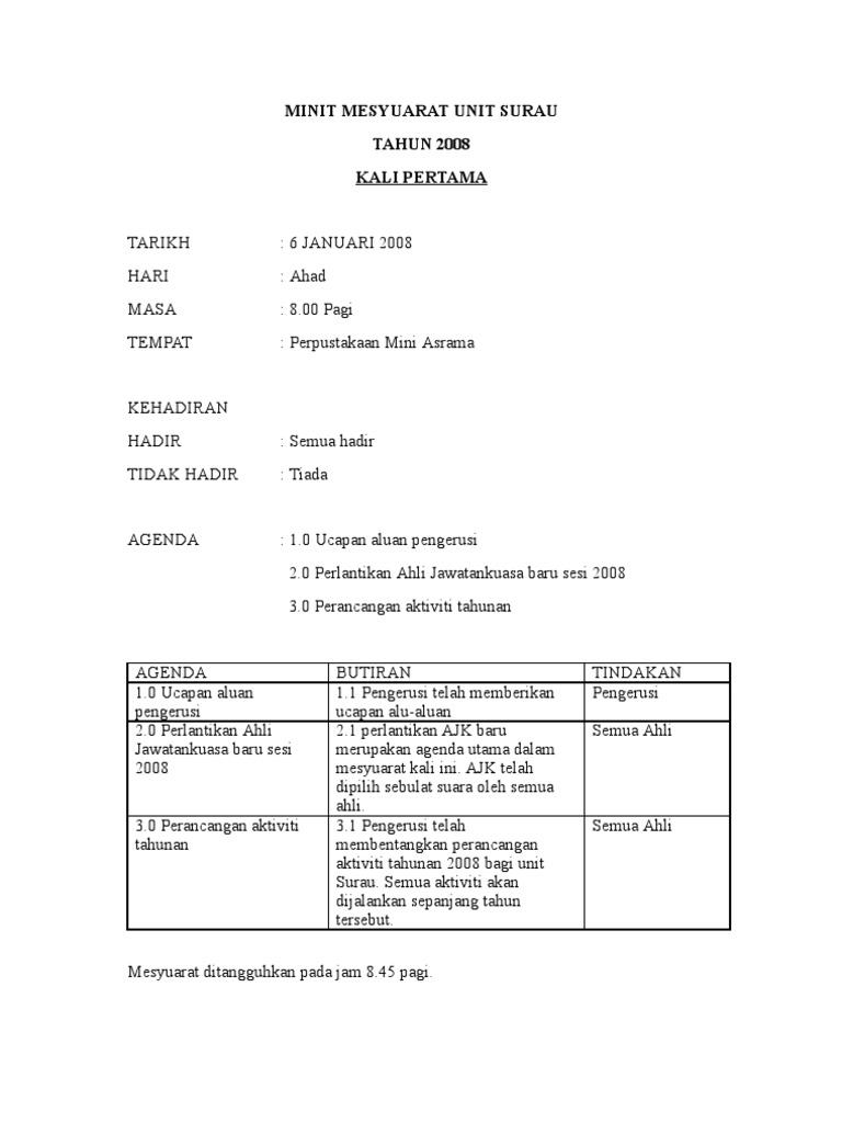 Minit Mesyuarat 1 2019 Flip Ebook Pages 1 3 Anyflip Anyflip from online.anyflip.com 0%0% found this document useful, mark this document as useful. Menerusi blog ini admin akan kongsikan beberapa contoh minit mesyuarat yang selalu digunapakain serta formatnya. Senarai contoh minit mesyuarat terkini : Minit mesyuarat atau minutes of meeting (mom) merupakan dokumen yang penting dalam mengetahui perjalanan sesuatu mesyuarat. Format (boleh copy / edit). Sekolah kebangsaan kampung raja uda pelabuhan klang. Pelantikan pengerusi dan pencatat sementara berikut merupakan senarai ajk penubuhan. Fokus mesyuarat 4.1 pelantikan ajk 4.1.1 senarai pelantikan ajk 4.4.2 soalan peperiksaan hendaklah disediakan mengikut contoh yang terdapat dalam buku dskp bahasa iban.