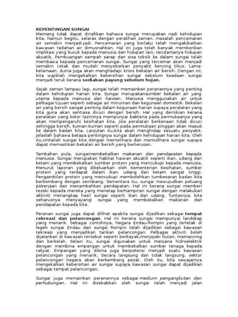 Karangan Kepentingan Sungai Kepada Manusia from imgv2-2-f.scribdassets.com Kepentingan sungai kepada manusia yang berikutnya ialah jalan pengangkutan terutama di kawasan pedalaman yang tiada kemudahan jalan raya. Kepentingan sektor pertanian yang mampu keadilan sosial dapat dilihat melalui sumbangannya dalam meluaskan lagi peluang pekerjaan dan sebagai sumber pendapatan utama kepada penduduk desa. Apa sih karangan narasi itu? Berbagai bentuk / jenis karangan diantaranya karangan narasi, deskripsi, argumentasi, eksposisi, dan persuasi. Misalnya, sungai amat penting untuk kehidupan kita seharian kerana sumber air adalah daripada sungai. Kepentingan sungai kepada manusia (tingkatan 1, 2, 3). Agama lah yang telah membimbing kita kepada moral, prilaku dan cara hidup yang diridhai oleh allah. Sungai memainkan peranan yang besar dalam membekalkan makanan dan minuman kepada manusia.