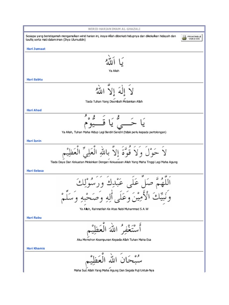 Zikir harian amalan imam al ghazaliini adalah amalan zikir imam al ghazali untuk dikongsi bersama boleh diamalkan dalam kehidupan harian kita, zikir pendek. Berzikir mengingati allah itu adalah ubat paling mujarab untuk jiwa.</p. Laa ilaha illallaah (tiada tuhan disembah melainkan allah), 1000 kali. Generally most of the top apps on android store have rating of 4+. Imam ghazali mengatakan, ada 4 amalan yang perlu kita membiasakan diri melakukannya selepas setiapkali menunaikan solat subuh setiap hari yaitu: