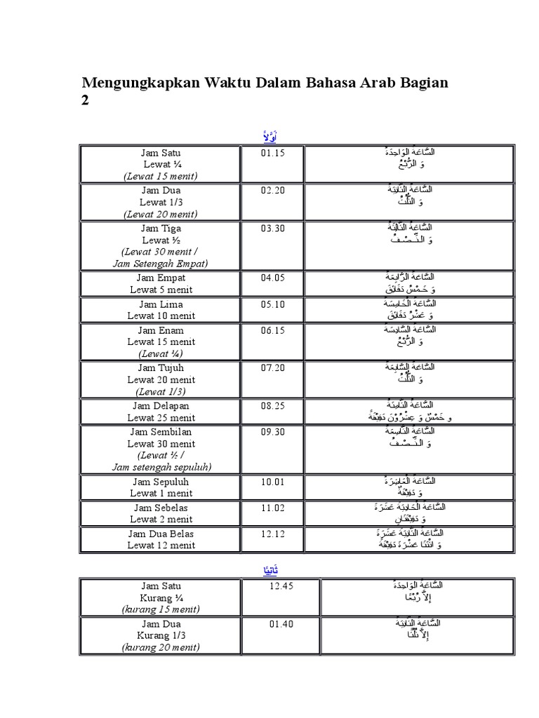Bahasa arab sendiri bagi umat islam tentu bukan sesuatu yang asing. Lihatlah bahasa alquran yang setiap hari anda baca dalam shalat anda! Kosakata bahasa arab tentang jam dan waktu. Ya allah kami memohon kepadamu keselamatan dalam agama, dan kesejahteraan/kesegaran pada tubuh dan penambahan ilmu, dan keberkahan rizqi, serta taubat sebelum mati dan rahmat di waktu mati, dan keampunan. Bahasa arab tahun 1 jais ( lagu anggota keluarga).