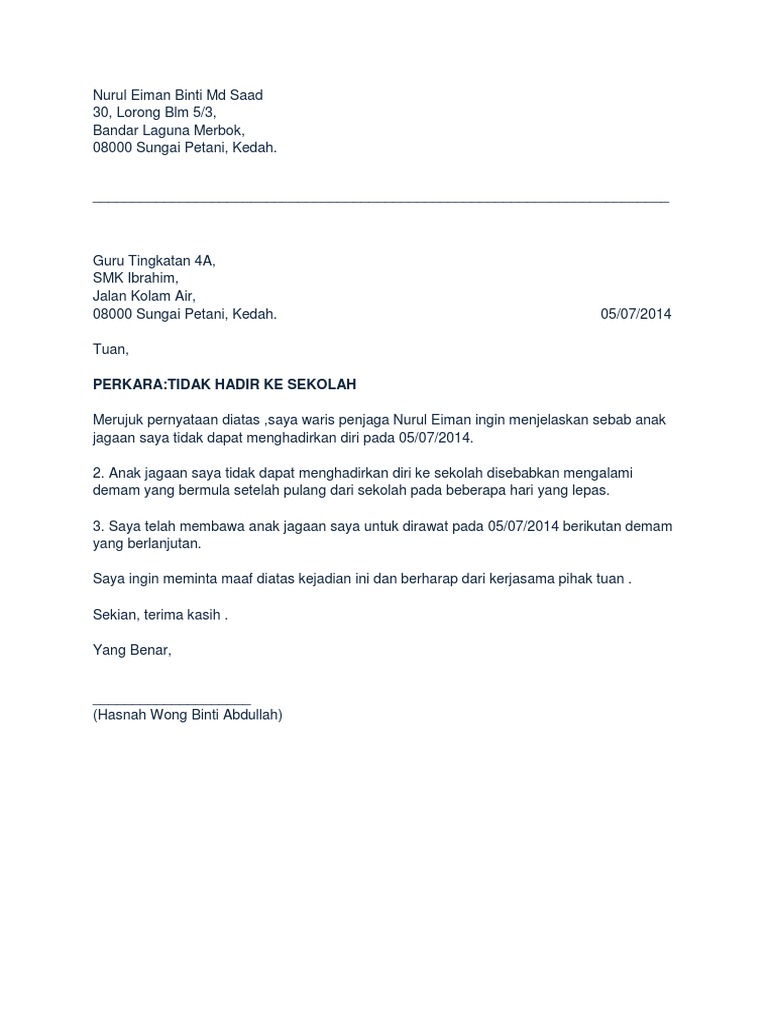 Jika anak anda tidak dapat menghadirkan diri ke sekolah atas alasan yang munasabah. Surat tidak hadir ke sekolah. Sekiranya anak tidak dapat hadir kesekolah, ibubapa hendaklah menghantar surat rasmi tidak hadir ke sekolah atau surat tunjuk sebab sebagai bukti kepada guru kelas dan. Pasti ada hari yang buatkan anda terpaksa tidak hadir ke sekolah. Sering kali para pelajar berhalangan untuk hadir sekolah. Surat tak hadir sekolah ni memang penting tau tak kisahlah sama ada anak tak hadir kerana demam ke, anak tak hadir sekolah kerana sakit perut ke untuk ibu bapa dan pelajar yang sedang mencari contoh surat rasmi tidak hadir ke sekolah, di sini akan diberikan beberapa contoh dan cara. Berikut disertakan contoh surat rasmi memohon cuti daripada pihak sekolah sekiranya pelajar tidak menghadirkan diri ke sekolah tanpa sijil sakit ataupun atas alasan lain yang kukuh atau munasabah. Surat rasmi yang perlu di tulis oleh pelajar untuk diberikan kepada guru dengan tajuk sebab tidak dapat menghadirkan diri ke asrama. Kandungan surat kandungan surat mestilah mempunyai beberapa perenggan yang mejelaskan mengenai tujuan surat tersebut dihantar. Apabila anak tidak hadir ke sekolah, kita perlu memberitahu guru kelas. Sepanjang saya tidak hadir ke sekolah ini, saya akan menyiapkan segala kerja sekolah yang diberi. Dan jika anda tidak bisa datang ke sekolah, maka anda harus mengirimkan surat permohonan izin. Contoh surat izin sakit ini bisa kamu gunakan untuk keperluan tidak masuk sekolah, kuliah, atau pun kerja.
