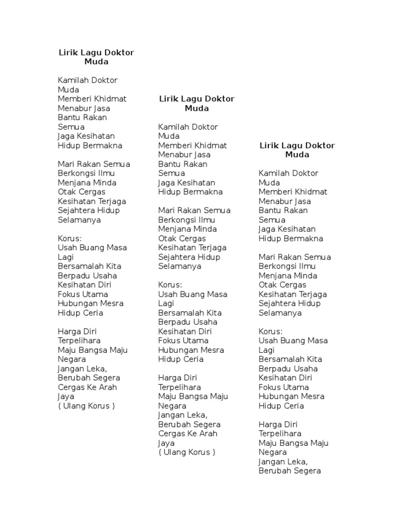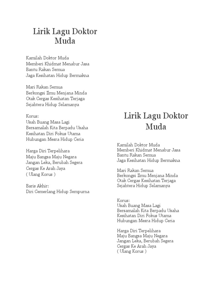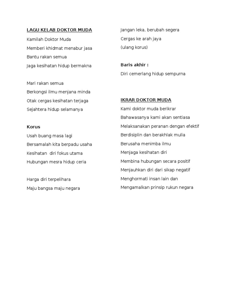 Usah buang masa lagi bersamalah kita. Faizul isak skls 10 months ago. Lirik lagu doktor muda kamilah doktor muda memberi khidmat menabur jasa bantu rakan semua jaga kesihatan hidup bermakna mari rakan semua berkongsi ilmu menjana minda otak cergas kesihatan terjaga sejahtera hidup selamanya korus: Mari rakan semua berkongsi ilmu menjana minda otak cergas kesihatan terjaga sejahtera hidup selamanya. Mari rakan semua berkongsi ilmu menjana minda otak cergas kesihatan terjaga sejahtera hidup selamanya.
